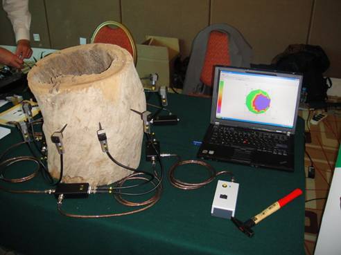根據樹干周圍多個傳感器之間的應力波傳輸速度測量,檢測出樹干腐朽或中空部分的位置及大小。   基本測量原理是,如果有兩個傳感器之間有孔,那么這兩個傳感器測得的應力波傳輸速度就會有差別。